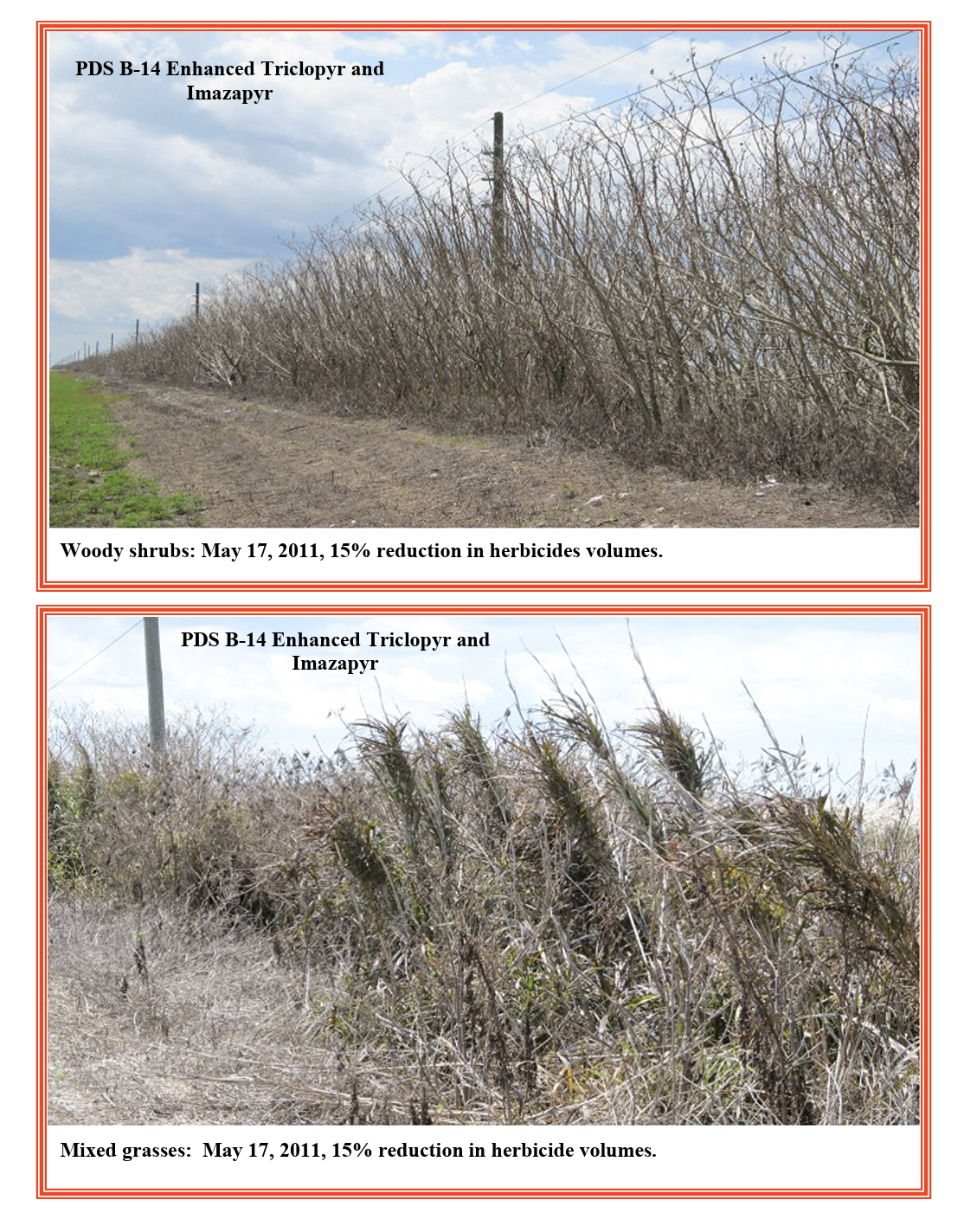 The woody shrubs sprayed with PDS B-14 enhanced mixtures demonstrated faster reactions to the applied herbicides and at significant herbicide reductions of 30% and 15%, when compared to the plants sprayed with the customary herbicide mixture without any PDS B-14.
